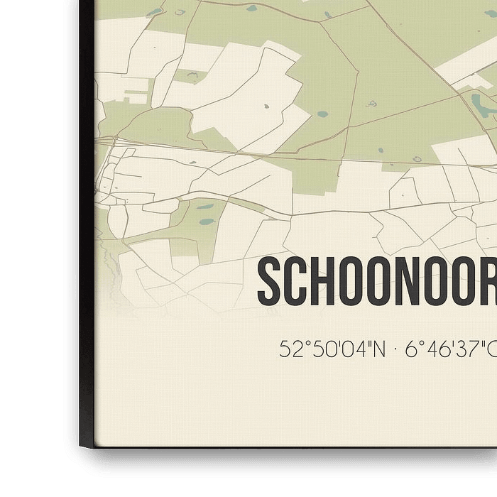 Carte rétro de Schoonoord, située dans la commune de Coevorden, province de Drenthe. La carte montre les routes publiques, les cours d'eau (lacs, ruisseaux et fossés) et les forêts dans et autour de Schoonoord. En outre, la carte contient les coordonnées de Schoonoord.