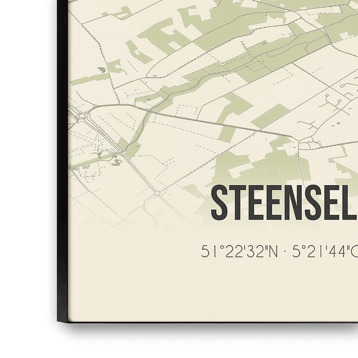 Carte rétro de Steensel, située dans la commune d'Eersel, province du Brabant-Septentrional. La carte montre les routes publiques, les cours d'eau (lacs, ruisseaux et fossés) et les forêts dans et autour de Steensel. En outre, la carte contient les coordonnées de Steensel.