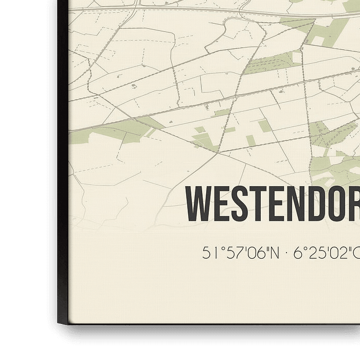 Carte rétro de Westendorp, située dans la région de Liemers, dans la commune de Oude IJsselstreek, province de Gelderland. La carte montre les routes publiques, les cours d'eau (lacs, ruisseaux et fossés) et les forêts dans et autour de Westendorp. En outre, la carte contient les coordonnées de Westendorp.