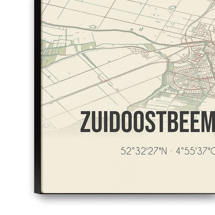 Carte rétro de Zuidoostbeemster, située dans la municipalité de Beemster, province de Hollande du Nord. La carte montre les routes publiques, les cours d'eau (lacs, ruisseaux et fossés) et les forêts dans et autour de Zuidoostbeemster. En outre, la carte contient les coordonnées de Beemster Sud-Est.