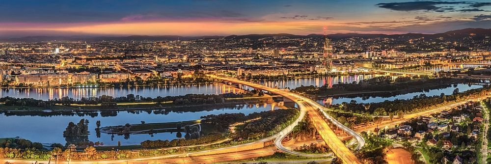 Vue panoramique sur le parc du Danube et le Danube avec l'île du Danube sur la vieille ville de Vienne dans la soirée. Panorama 310197ays