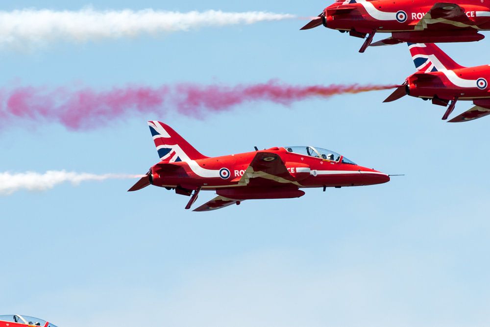 4 Leden van de Red Arrows, het demonstratieteam van de Engelse Royal Air Force, vliegen met rook in formatie tijdens een vliegshow. De Red Arrows gebruiken BAE Hawk T1 straaljagers voor hun show.
