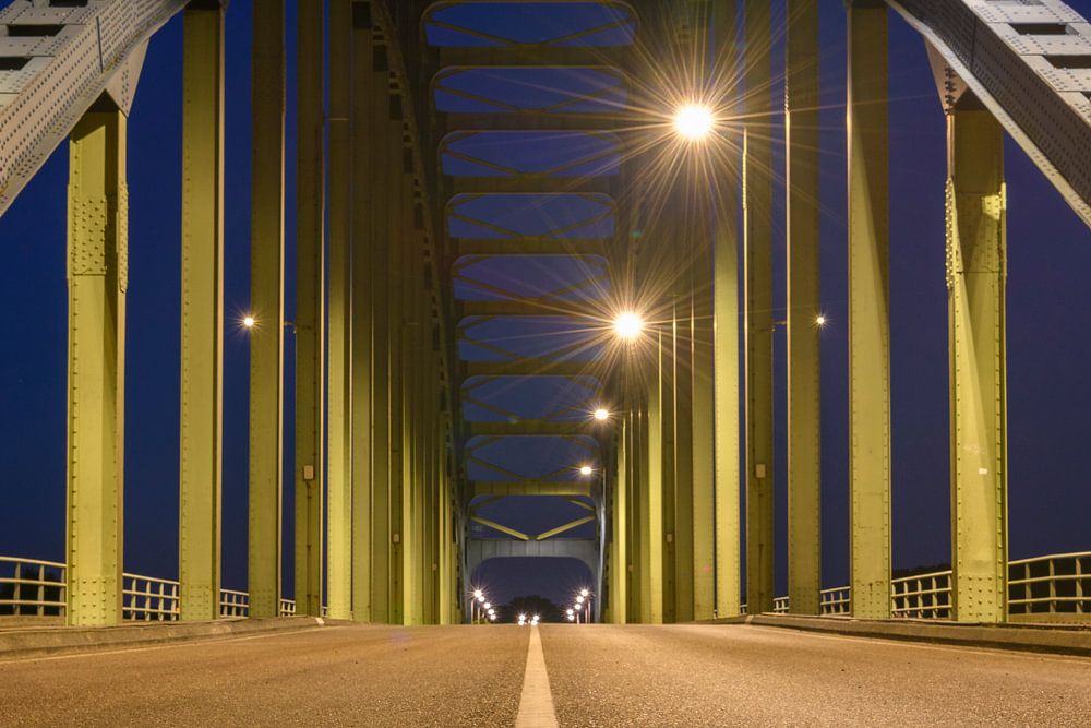 Photo du soir de l'ancien IJsselbrug sur la rivière IJssel entre Zwolle et Hattem après le coucher du soleil. Vue du milieu de la route sur le vieux pont en arc d'acier.