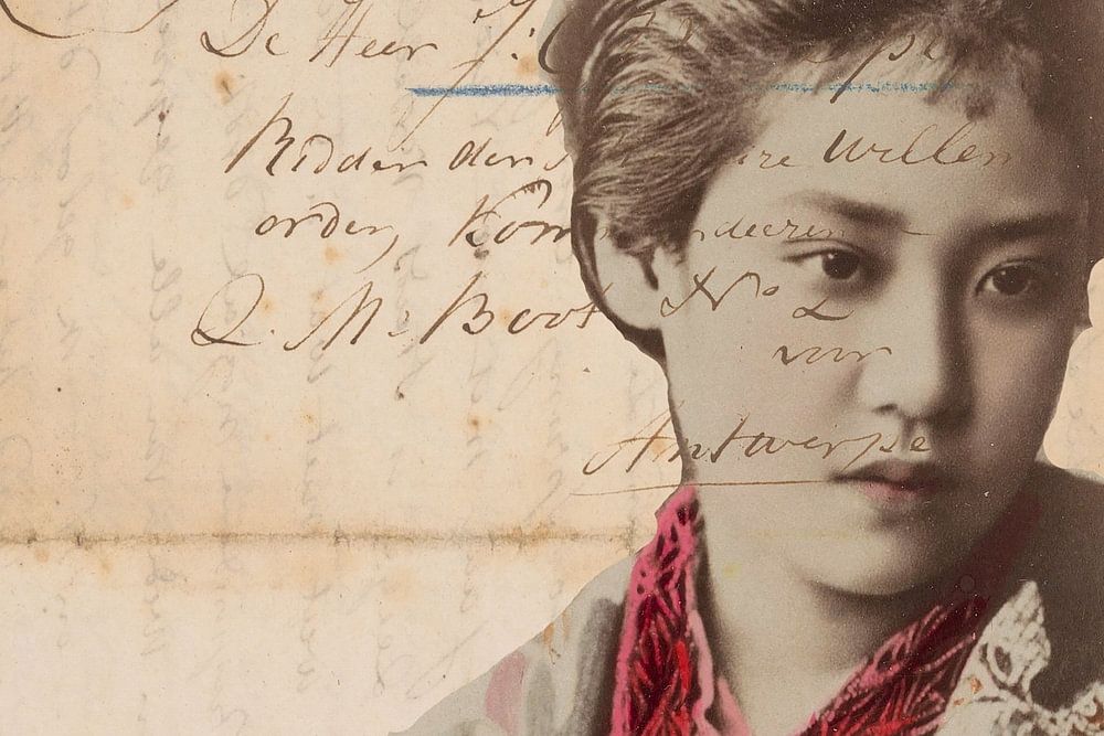 Collage vintage dans des tons de terre avec des accents de couleur. Lettre et enveloppe en combinaison avec la femme japonaise Geisha.
