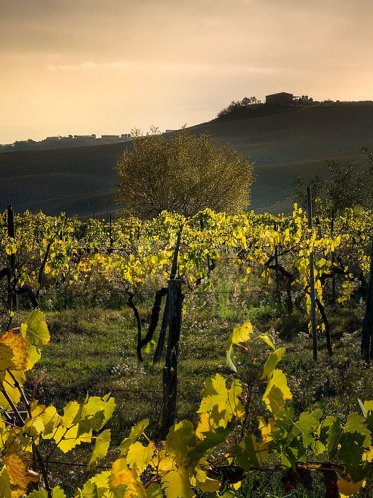 Paysage du paysage de collines en Toscane en Italie / Italie du Nord. Atmosphère de la Toscane avec des vignes aux feuilles d'automne dorées entre collines, champs et prairies.