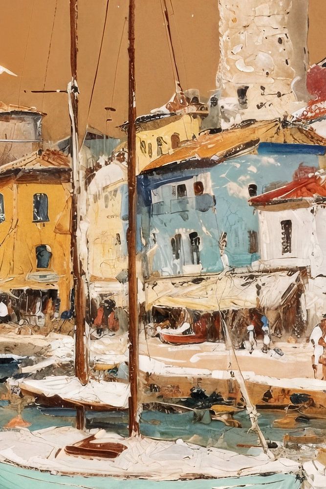 Village côtier tranquille et impressionniste avec des voiliers et des sentiers.