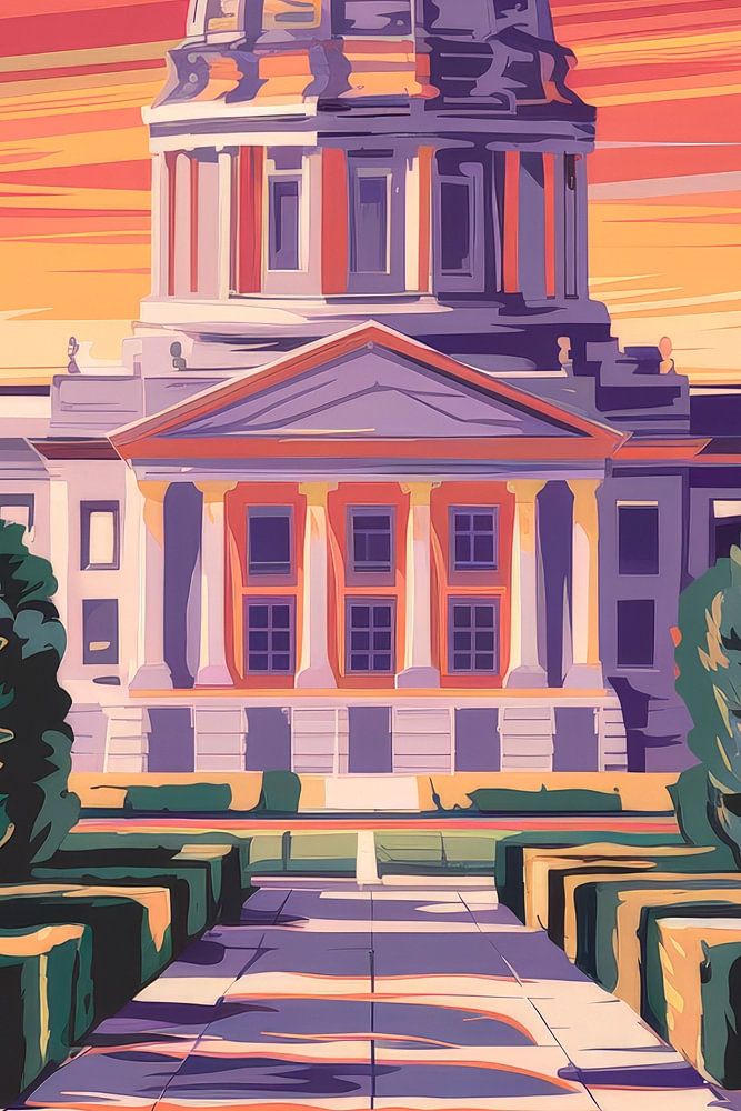 Une construction majestueuse se dresse devant un coucher de soleil spectaculaire, dont les couleurs chaudes accentuent habilement l'architecture. Les jardins bien entretenus invitent au rêve de la détente et de la découverte. Parfaite pour le salon, cette œuvre d'art apporte un sentiment d'histoire et de foyer dans chaque pièce.