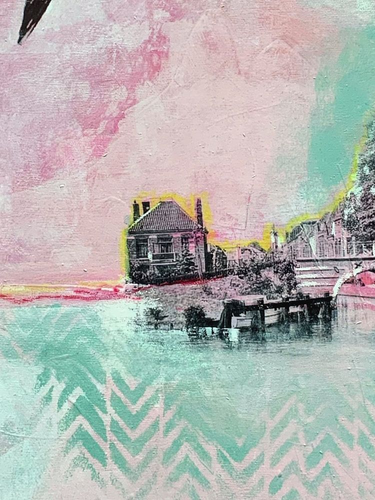 Il s'agit d'une œuvre d'art moderne, réalisée à l'aide de techniques mixtes rappelant le collage, dans des couleurs vives qui font référence à la riche histoire de Leyde.