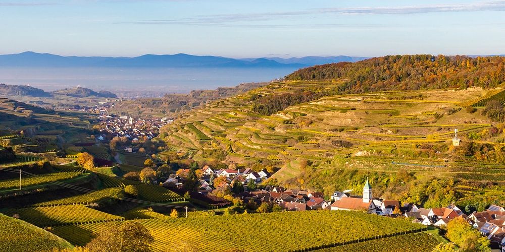 Panorama des villages viticoles de Schelingen et Oberbergen à Vogtsburg dans le Kaiserstuhl en automne.