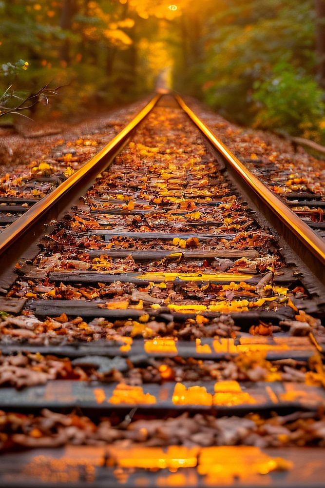Cette superbe œuvre d'art capture la beauté enchanteresse de l'automne. Une voie ferrée solitaire serpente à travers une forêt aux teintes chaudes d'orange, de jaune et de rouge, tandis que le soleil couchant jette une lueur dorée sur le paysage. La composition de l'image crée un sentiment de profondeur et de perspective, entraînant le spectateur dans un voyage visuel le long de la voie ferrée. Le rendu détaillé des feuilles et des textures ajoute une dimension supplémentaire à l'œuvre d'art, lui conférant une sensation réaliste et tactile.