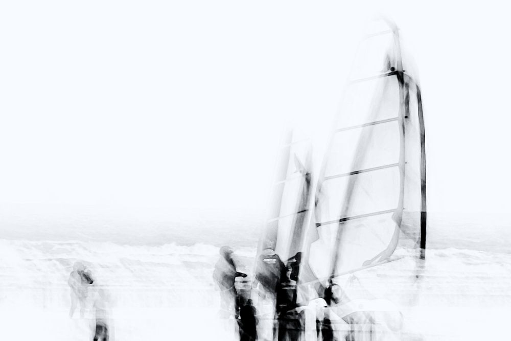 Voile de plage sur la côte normande utilisant les vents forts sur la côte. Exposition multiple et panoramique.