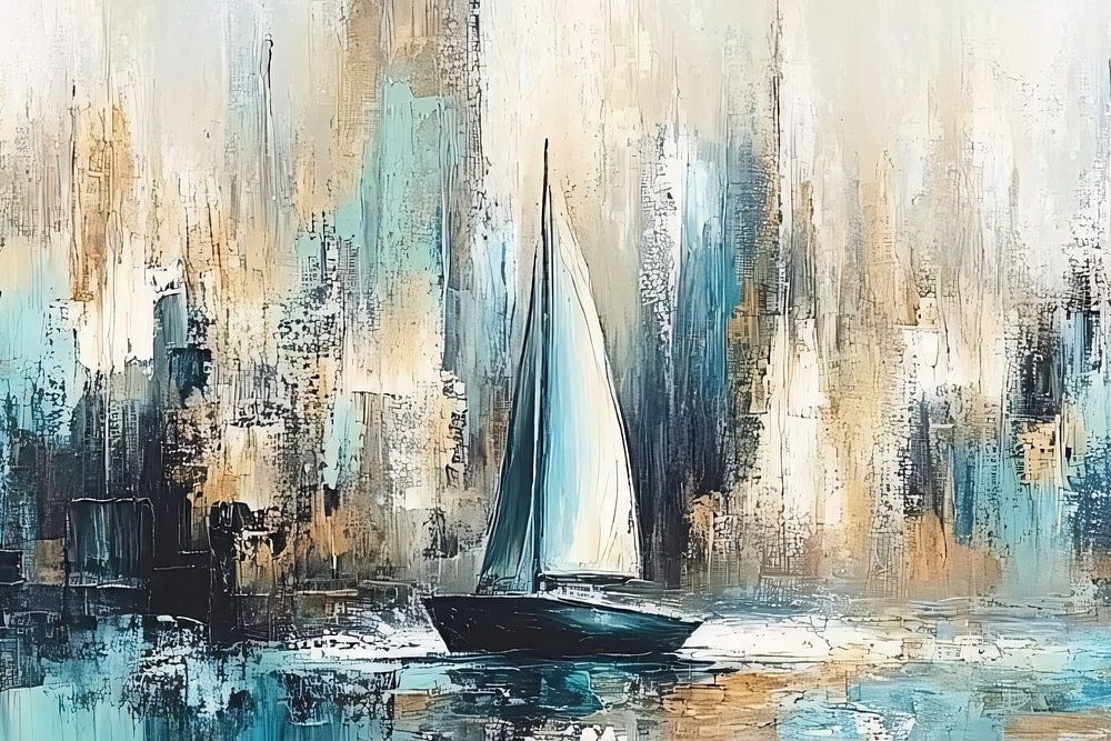 Cette magnifique œuvre d'art abstraite capture l'essence d'une ville et d'un voilier serein dans un design unique et dynamique. Le mélange sophistiqué de couleurs douces telles que le bleu, le blanc, l'or et le beige crée une atmosphère apaisante, parfaite pour les intérieurs modernes. Le tableau reflète un sentiment de liberté et d'équilibre, où l'eau et la ligne d'horizon se fondent harmonieusement. Ce tableau polyvalent est idéal pour égayer une pièce et lui donner une touche contemporaine, qu'il soit placé dans un salon, un bureau ou une chambre à coucher. Ajoutez une touche d'élégance à votre intérieur avec cette œuvre d'art qui allie harmonieusement modernité et nature.