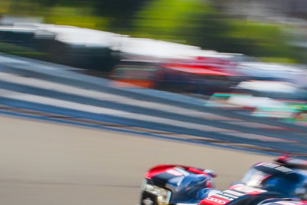 La voiture de course Audi Sport Team Joest R18 e-tron quattro Le Mans Prototype roule à l'Eau Rouge. La voiture no. 8 a remporté les 6 heures du WEC 2016 de Spa Francorchamps dans la catégorie LMP1 - H et au classement général. Image panoramique avec un fort flou de mouvement et un logo Audi au point.