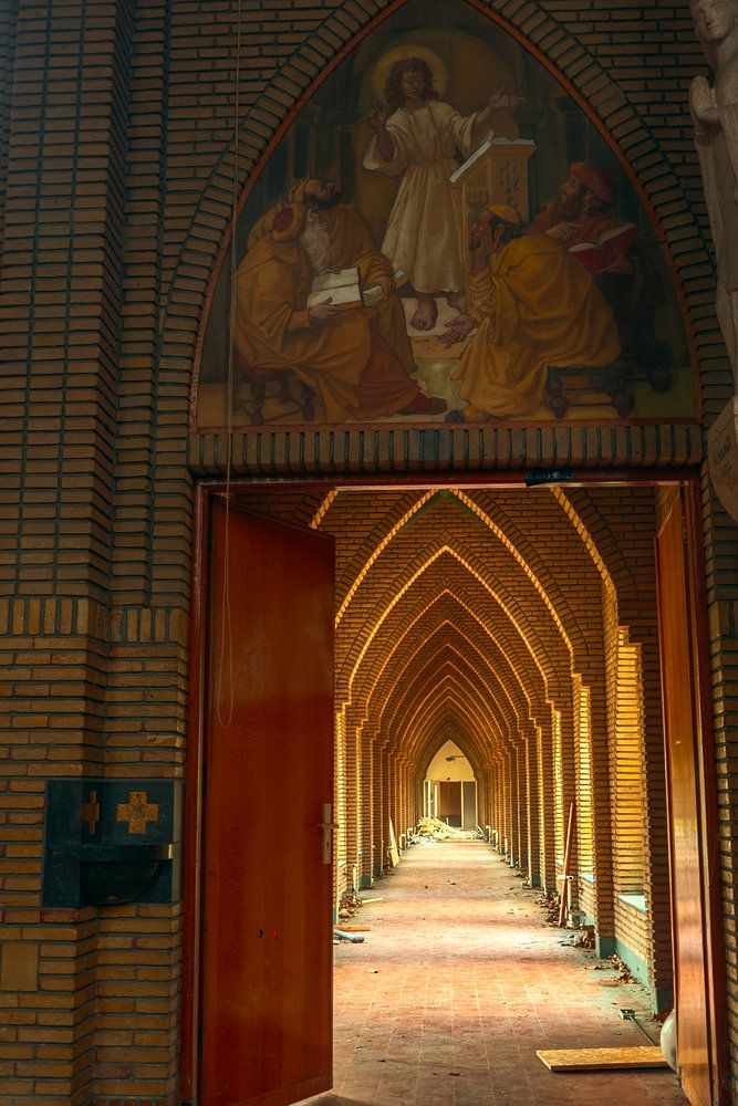 Aventurez-vous dans un voyage mystique à travers le long passage d'un monastère abandonné, où les vitraux scintillent comme des joyaux intemporels. Plus loin, des statues angéliques gardent l'ancien couloir avec une grâce sereine. Le passage dégage une atmosphère de tranquillité et de splendeur feutrée, où les jeux de lumière, de verre et d'images célestes racontent une histoire qui touche l'âme. Entrez et laissez-vous séduire par cette symphonie intemporelle de spiritualité et de splendeur architecturale.