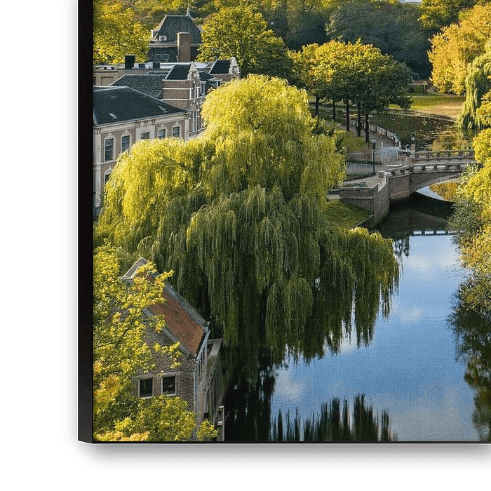 Vue aérienne du centre-ville de Zwolle par une belle journée d'automne ensoleillée. Vu d'en haut, on peut voir le feuillage d'automne sur les arbres et divers bâtiments historiques à l'arrière-plan.