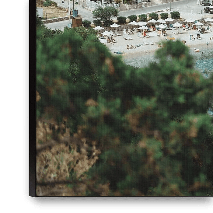 Achetez cette œuvre d'art de paysage Vue d'un village grec avec une mer azur | Photographie de voyage - tirage photo d'art | Grèce, Europ par Sanne Dost sur toile, aluminium, ArtFrame ou photographie (encadrée), impression d'art en haute qualité et tout format.