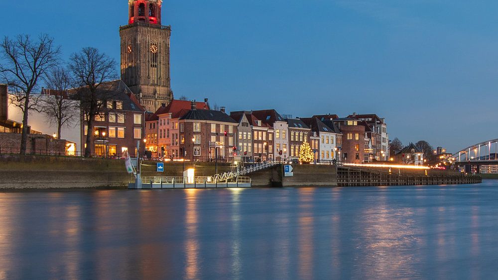 Belle vue de Deventer avec un sapin de Noël sur le quai. La photo a été prise par une belle soirée de la mi-décembre 2020.