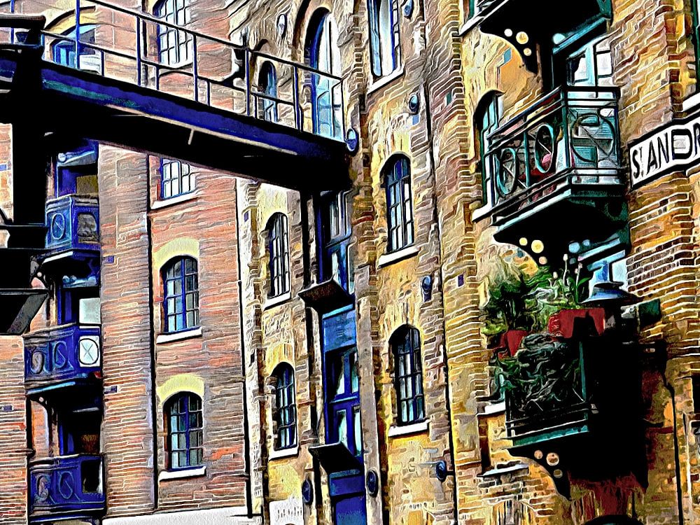 Une partie de l'étonnant projet de rénovation de 20 ans autour de Butlers Wharf et Shad Thames à Southwark Londres. Cette image montre clairement le bâtiment appelé St Andrews Wharf et certaines de ses caractéristiques d'origine. Il s'agit notamment des balcons et des passerelles métalliques qui auraient facilité le déplacement des marchandises entre les entrepôts jusqu'au début des années 1920, lorsque le port de Londres est tombé en désuétude. Photo art.
