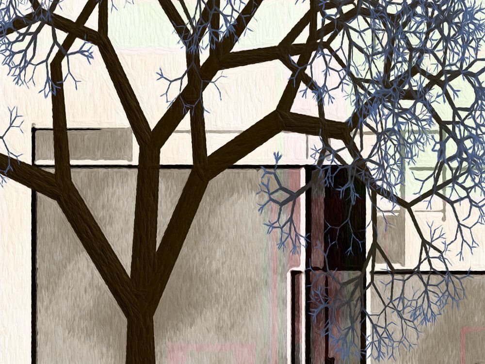 Au premier plan, un arbre est minimalement rendu dans une teinte bleue.