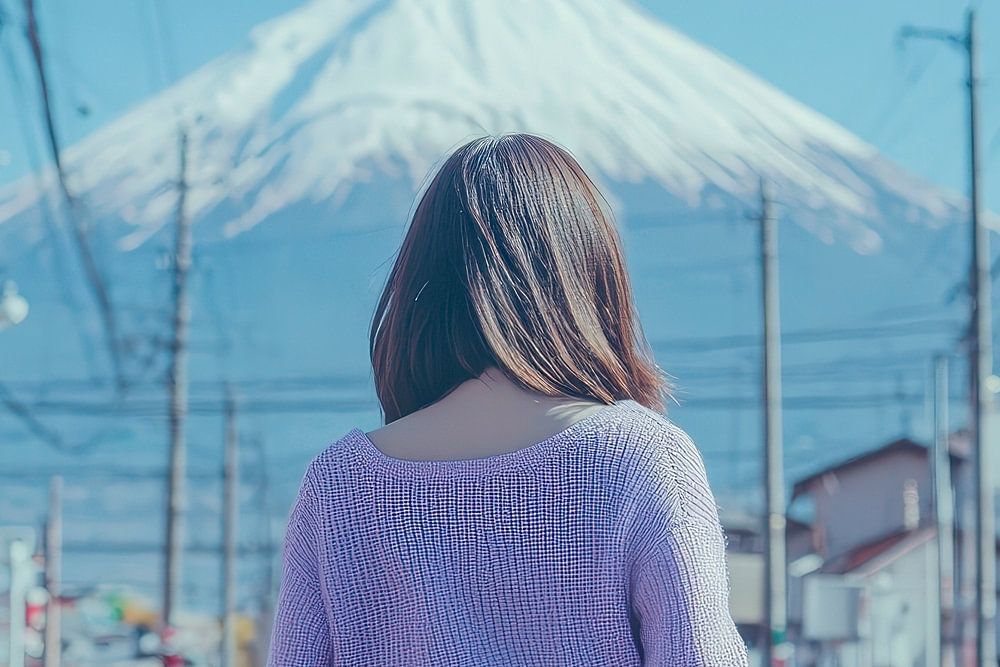 Un motif fascinant qui capture la liberté et la beauté de la nature. Au premier plan, une jeune fille pensive, tandis que le majestueux Fuji domine la scène à l'arrière-plan. Les couleurs harmonieuses et la vue lointaine confèrent à une pièce calme et inspiration - idéal pour la chambre à coucher ou un coin lecture confortable dans le salon.
