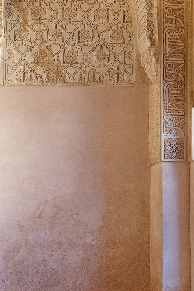 Sur cette photo, l'architecture mauresque se reflète dans les élégantes arches. La lumière latérale jette une lueur mystérieuse sur la scène et accentue les détails raffinés des sculptures. Les tons terreux des murs, combinés au stuc spécial et aux magnifiques sculptures de l'arche située au-dessus, créent une riche palette visuelle. La transition entre les tons chauds de la terre en bas et le jaune doux en haut donne de la profondeur et du caractère à l'image, tandis que le sol est décoré de carreaux présentant un intrigant motif en zigzag composé de blanc, de noir et de vert foncé.