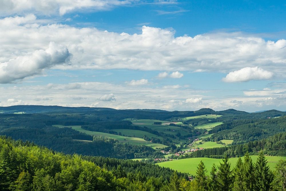 Vue panoramique à l'infini sur un paysage de forêt noire avec un ciel bleu et un petit village au loin