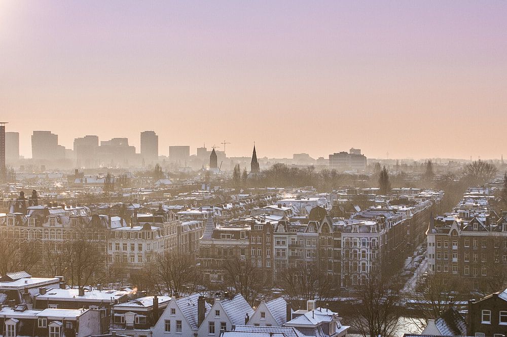 Admirez la magnifique ville d'Amsterdam depuis ce point d'observation unique. Juste avant le coucher du soleil, l'atmosphère offre un spectacle de couleurs magnifiques en cette froide journée d'hiver.