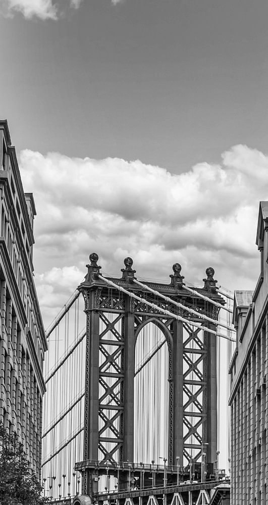 Vue de Brooklyn sur le pont Manhatten à New York par une journée ensoleillée en noir et blanc