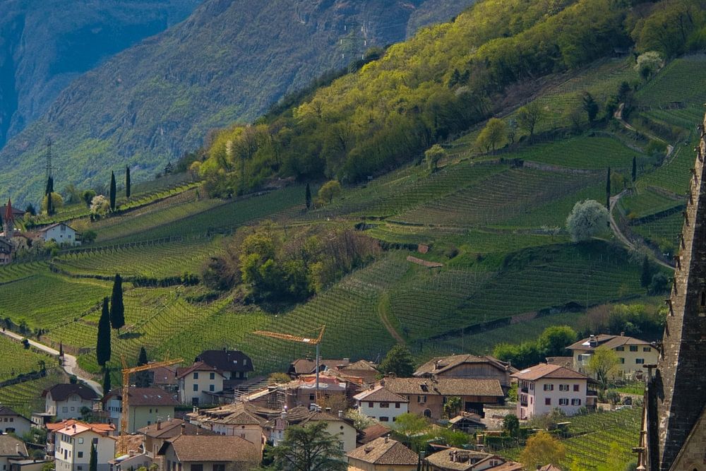 Vue sur le village viticole de Tramin dans la région de Bolzano-Alterno dans le Tyrol du Sud au printemps