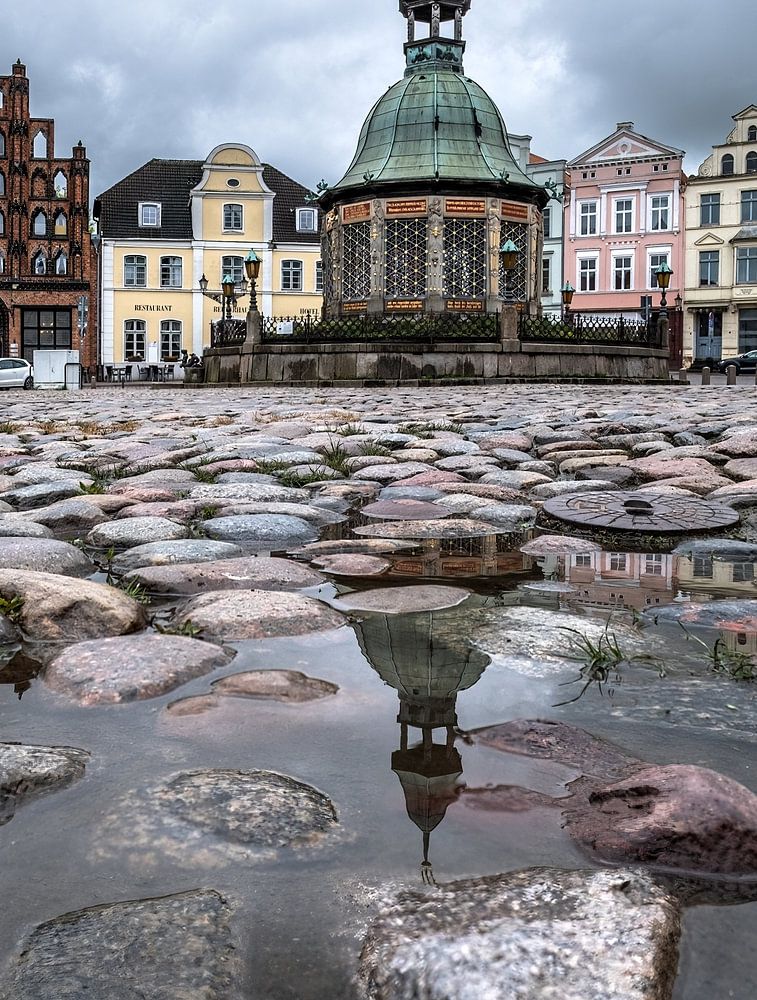 Avec une moyenne de 161 jours de pluie par an, il est possible à Wismar de contempler l'art aquatique de la place du marché même dans les flaques d'eau.