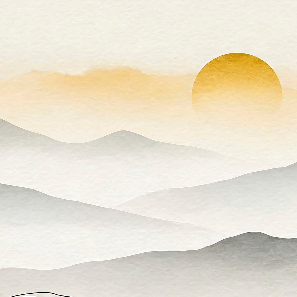 Peinture minimaliste et abstraite d'un paysage de montagne brumeux avec soleil levant.
