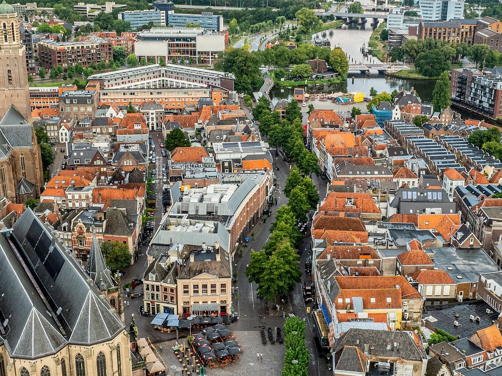 Le centre-ville de Zwolle avec des nuages d'orage au loin lors d'un coucher de soleil à la fin d'un après-midi d'été chaud et humide.