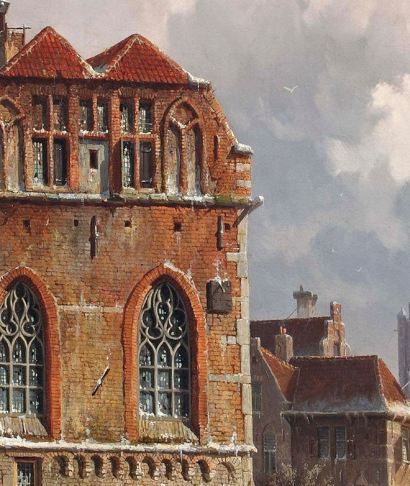 Vue de la Vieille Gasthuis à Zwolle : des patineurs sur une voie d'eau gelée avec une vue en capriccio de la Binnen-Gasthuis, Zwolle