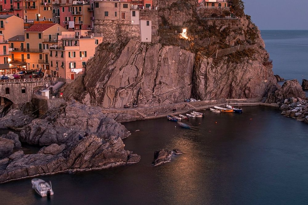 Cinque Terre, site du patrimoine mondial de l'UNESCO situé en Ligurie, en Italie, comprend cinq charmants villages le long de la côte : Monterosso al Mare, Vernazza, Corniglia, Manarola et Riomaggiore. Ces villages pittoresques, reliés par des sentiers sinueux et des maisons colorées adossées aux collines, forment un paysage à couper le souffle. La Méditerranée turquoise offre un contraste saisissant avec les falaises escarpées et les collines verdoyantes qui ornent la région. Les visiteurs peuvent profiter de vues pittoresques depuis les chemins de falaise qui relient les villages, tout en étant récompensés par des vues panoramiques le long du chemin.