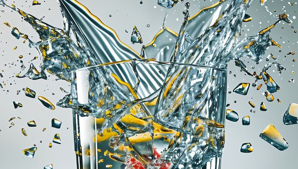 Les éclats se propagent dans toutes les directions comme une explosion. Certains fragments semblent nets et détaillés, d'autres sont légèrement transparents et reflètent la lumière, créant ainsi une impression de mouvement. Le liquide jaillit du verre de manière dramatique, formant d'élégantes gouttes et des trajectoires sinueuses qui semblent flotter dans l'air.