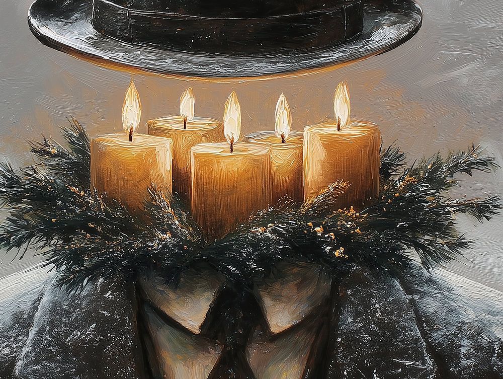 De bolhoed zweeft net boven de krans, gepolijst en klassiek van vorm, met subtiele sneeuw- of verfstippen die de winterse sfeer benadrukken. Die hoed geeft het tafereel een menselijke hint zonder ooit een gezicht te tonen; het is een knipoog naar nette herenkleding uit vroeger tijden, gecombineerd met een vrolijke kerstwending. De hoed en de kaarsen samen maken het beeld tot een surrealistisch schilderij waarin herkenbare objecten nieuwe rollen krijgen: een hoed als denkbeeldige kroon, kaarsen als warm hoofd.
