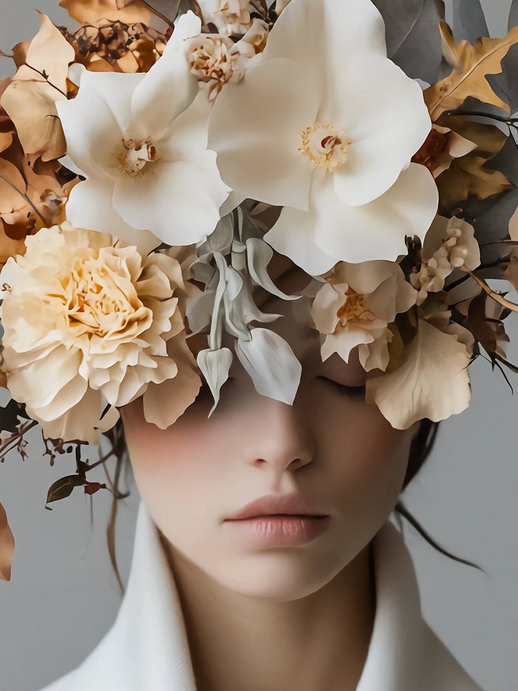portrait d'une femme en blouse blanche avec des fleurs dans la tête