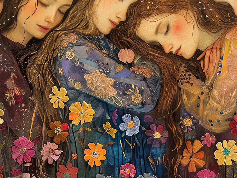 femmes ensemble les yeux fermés dans un style pittoresque avec des fleurs et des étoiles dans une image romantique