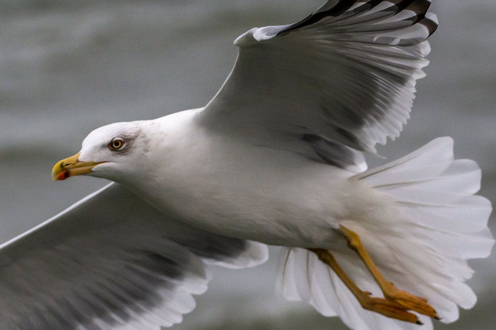 geelpootmeeuw in de vlucht boven de Waddenzee.