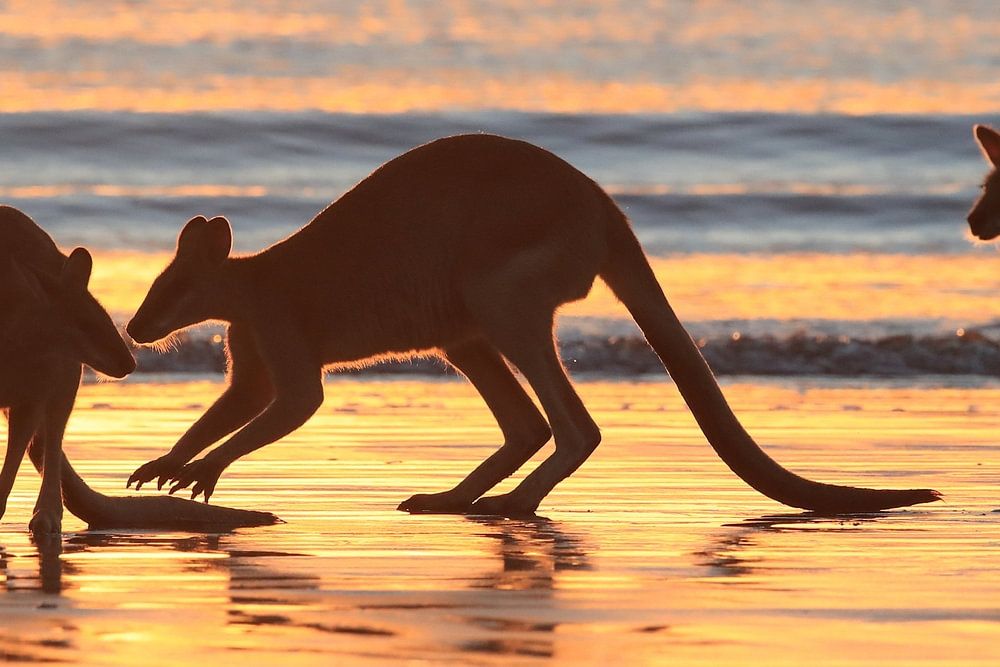 A propos de "kangourou sur la plage au lever du soleil, mackay, queensland du nord, australie"