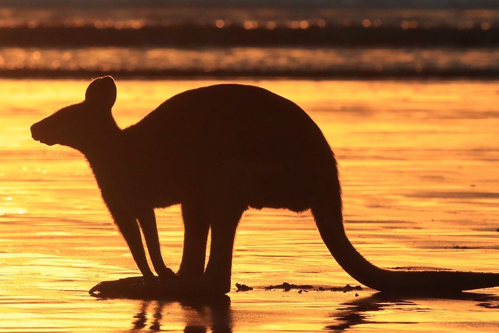 kangourou sur la plage au lever du soleil, mackay, queensland du nord, australie