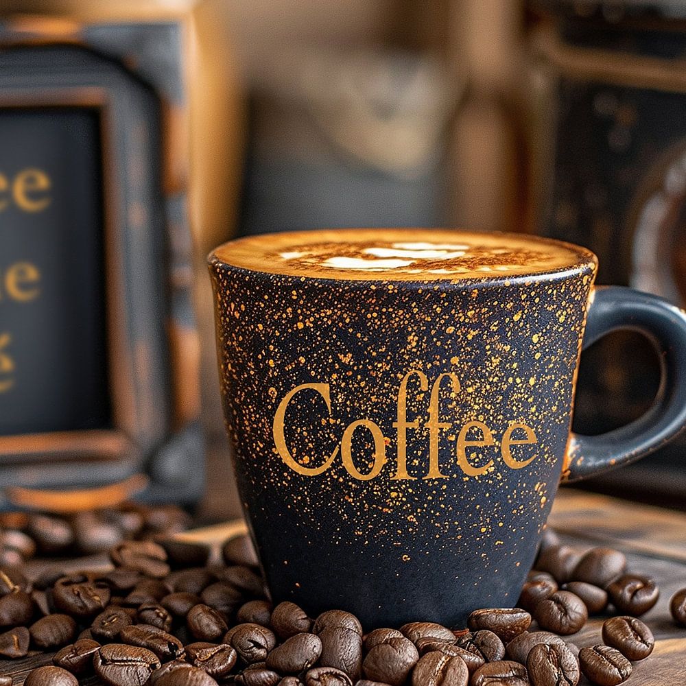 Grande tasse de café posée sur une planche en bois, entourée de grains de café. Un bar à café est visible à l'arrière-plan.
