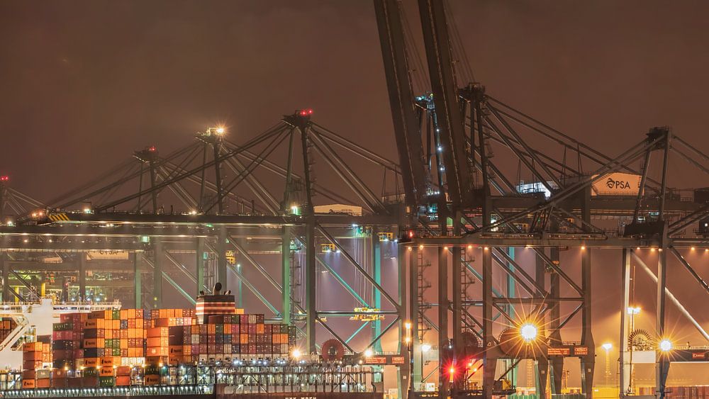 navire de déchargement de conteneurs lumineux avec des grues géantes, Anvers par Tony Vingerhoets