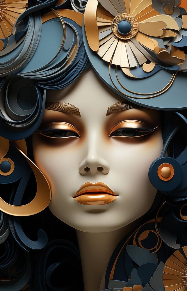 œuvre d'art abstraite représentant un visage féminin très blanc avec diverses fleurs et formes gracieuses autour de sa tête