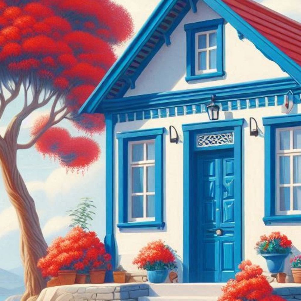 Une petite maison blanche avec des détails bleus et un arbre rouge, au bord de l'eau avec un bateau. L'ensemble a un peu l'atmosphère de la Grèce et rappelle les vacances, le repos et le plaisir.