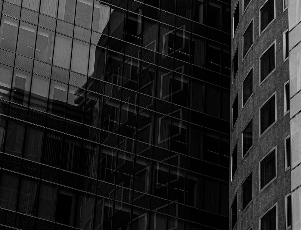 Superbe photo en noir et blanc de deux bâtiments de la gare de Bruxelles-Nord.