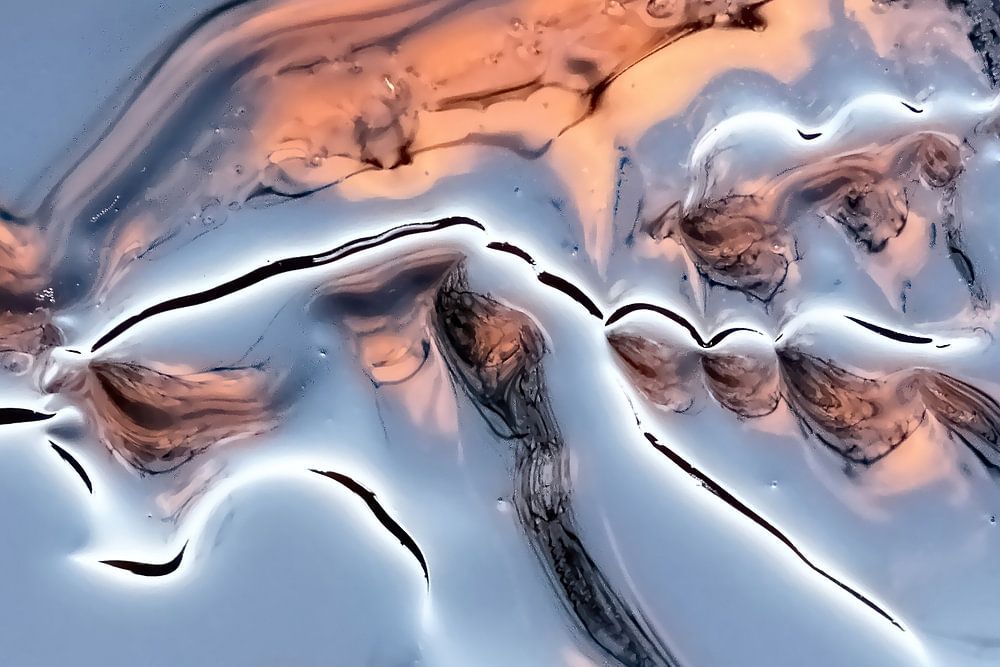 Le dégel s'est installé. Les derniers flocons flottent sur l'eau. Les nuages colorés en rouge par le soleil tardif se reflètent dans la banquise.