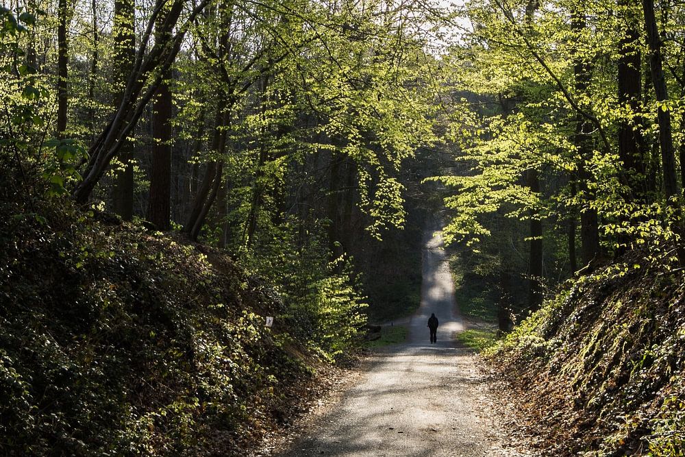 au loin, un promeneur solitaire dans les bois sur un chemin