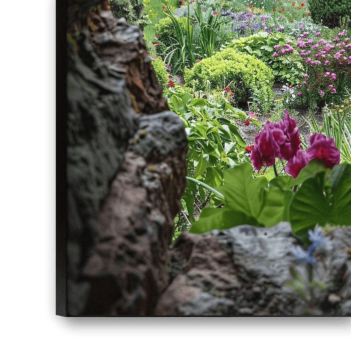 Découvrez la beauté enchanteresse d'un jardin caché, encadré par une structure en pierre. Une explosion de couleurs et de fleurs vibrantes, du rose tendre au violet profond, remplit la toile d'un sentiment d'émerveillement et de sérénité. La lumière du soleil filtre à travers le feuillage, projetant des ombres dansantes et soulignant les détails délicats de chaque pétale. Cette œuvre d'art invite à un moment de repos et de réflexion en se perdant dans la splendeur de la nature.