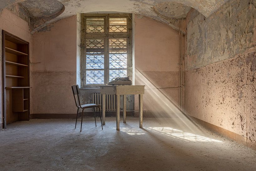Un bureau dans un sanatorium abandonné quelque part en Italie. La pièce jouxte un couloir dont le sol a disparu à certains endroits ou dans lequel les armoires du couloir s'enfoncent lentement dans le sol. Une vieille machine à écrire sur une table avec les beaux rayons de soleil entrants rendent cette pièce magnifique. Quelles lettres ont toutes été écrites ici dans le passé ? .....